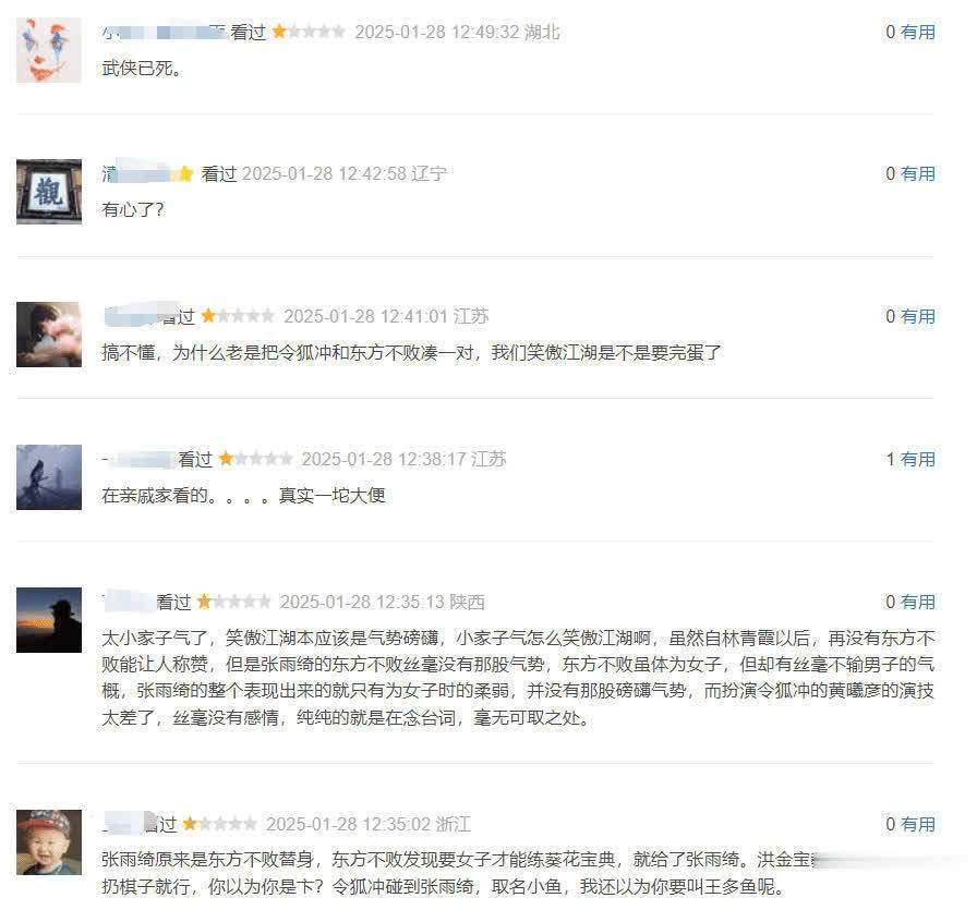 今年1月28日除夕当天,《笑傲江湖》开始在平台上正式播出,一时间也是引来了观众们的集体差评,而且观众们的差评都很一致。