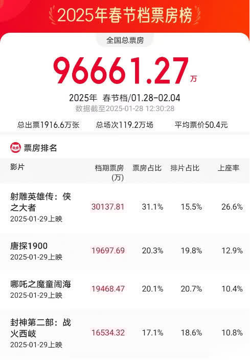 其中金庸武侠片《射雕英雄传之侠之大者》(以下简称《射雕》)的预售票房已经超过了3亿人民币,《哪吒之魔童闹海》和《唐探1900》各自的预售票房则都已经接近2亿人民币,《封神第二部》同样也是在1.5亿人民币以上。